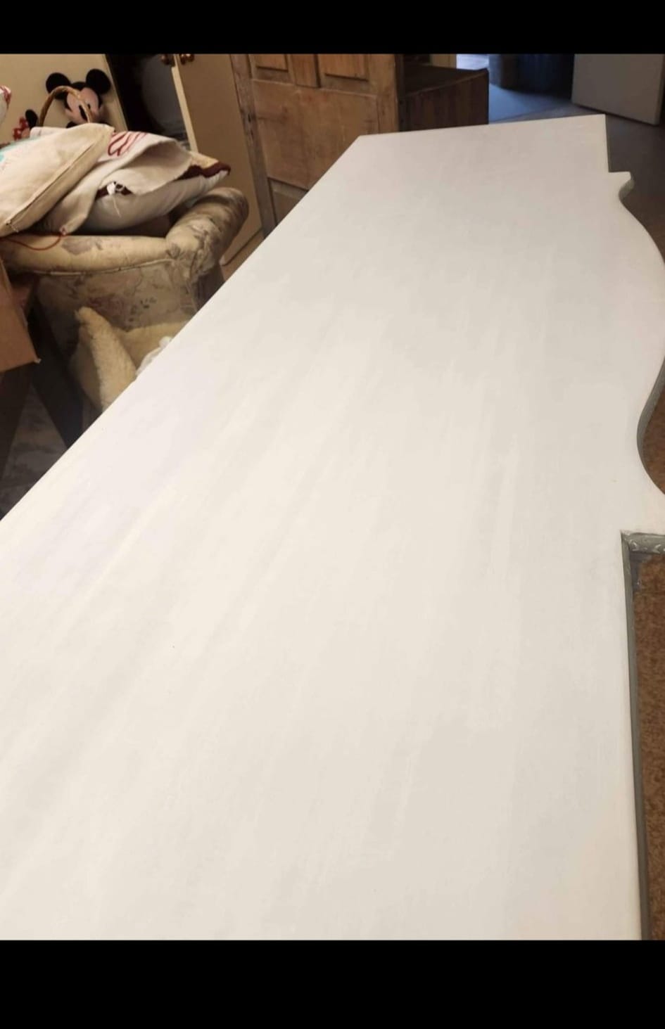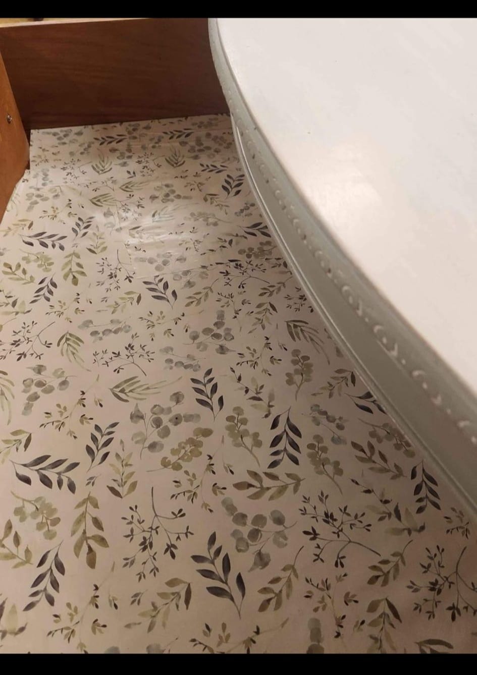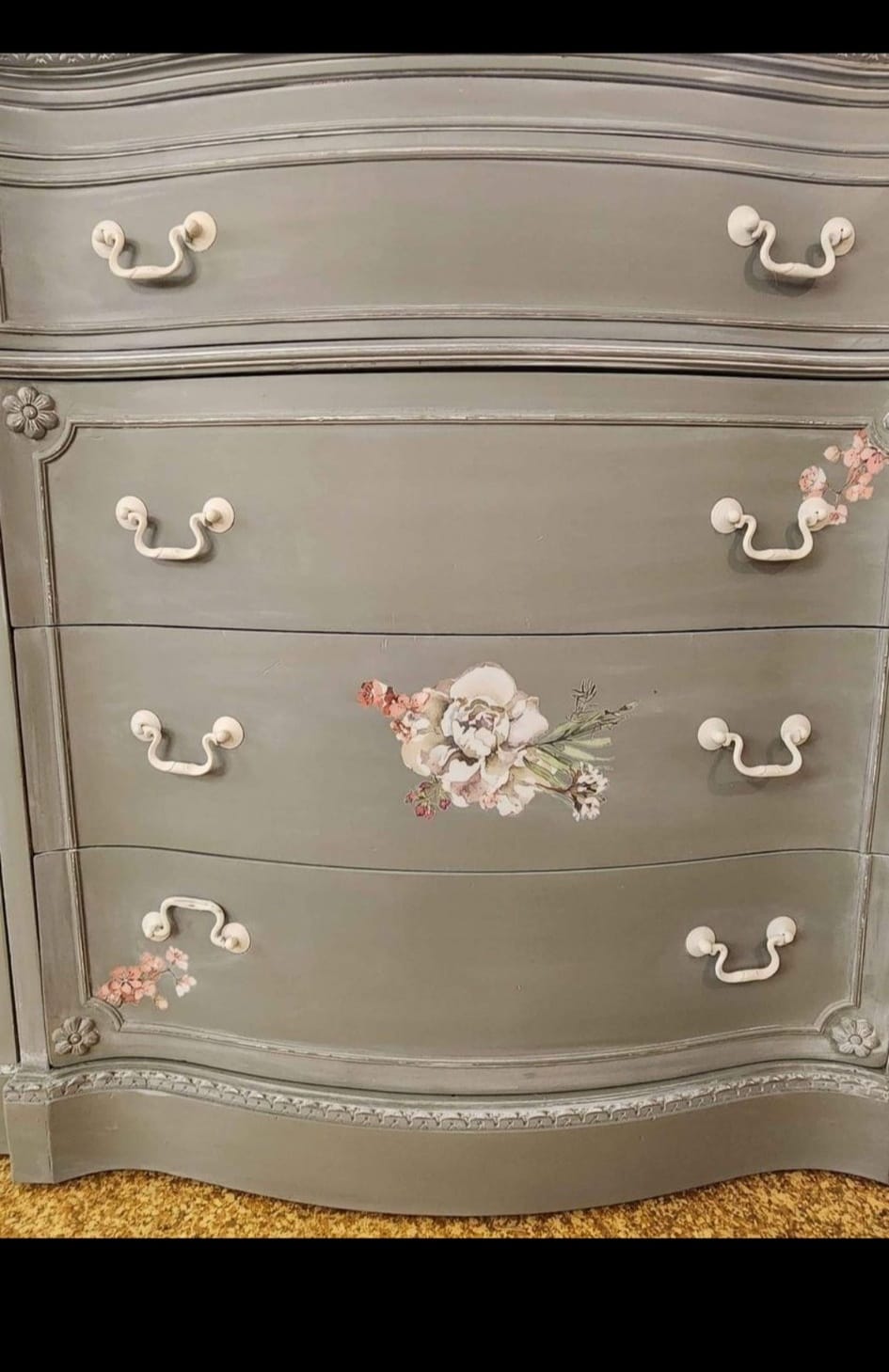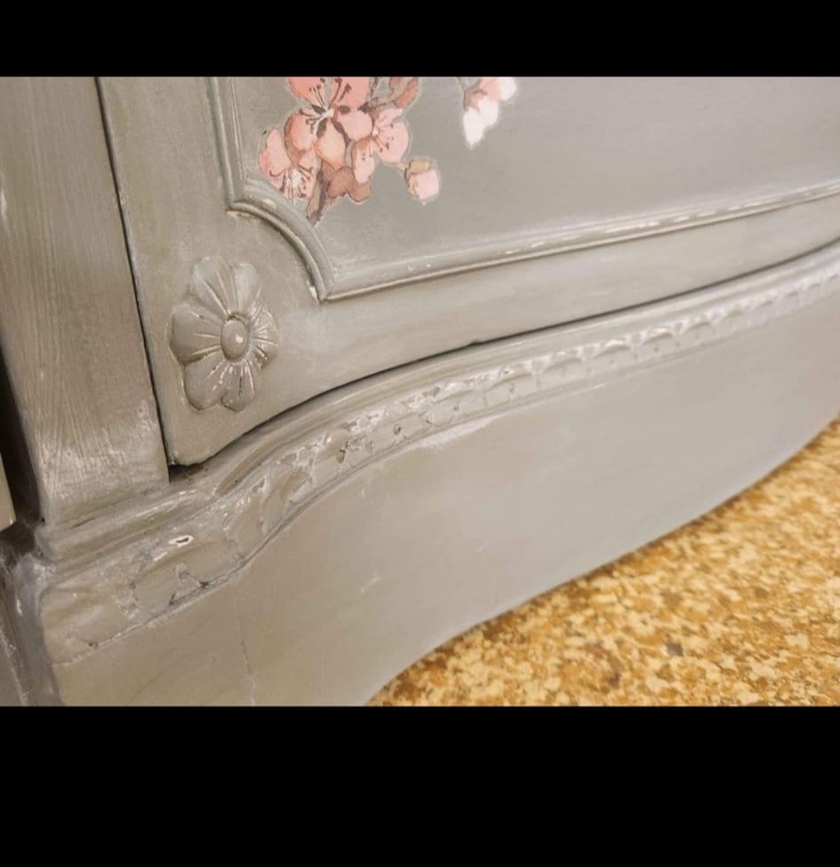 PAINTED IN FUSION PAINTS BEAUTIFUL COLOR NEWILL AND THEN WHITE STAIN BRUSHED OVER AND WHITE STAINED TOP. FINISHED WITH IRON ORCHID DESIGNS TRANSFER- ELYSIUM- THIS IS TRULY A ONE OF A KIND PIECE